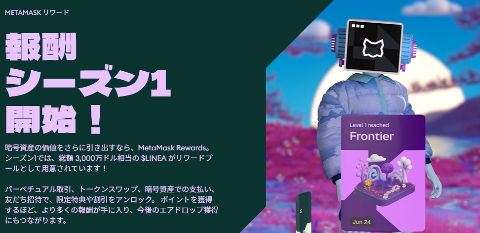 2025年10月28日から2026年1月23日までの90日間でMetaMask Rewardsのシーズン1が開催されています。
