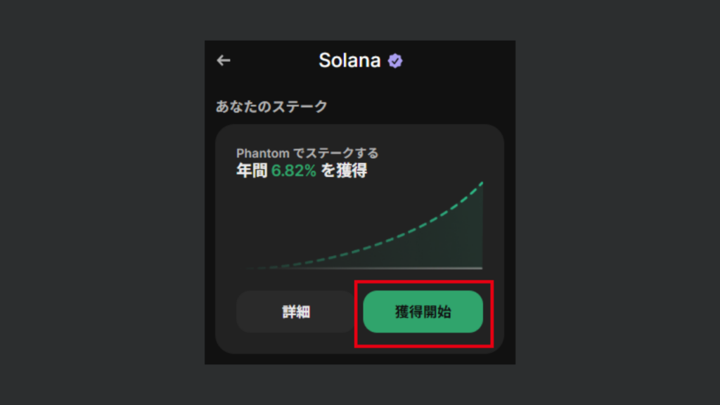 銘柄一覧からソラナ(SOL)を選択すると、ステーキングに関する情報が表示され、「獲得開始」を押下すると、ステーキングの申込画面に遷移します。