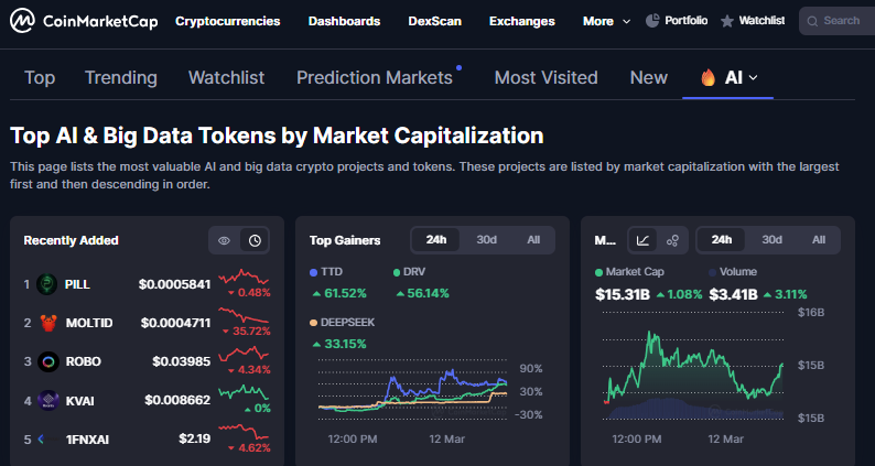 世界最大級の暗号資産(仮想通貨)データサイトであるCoinMarketCapでもAI関連銘柄の専用ページが用意されており、日々新しいプロジェクトが登場しているのが確認できます。
